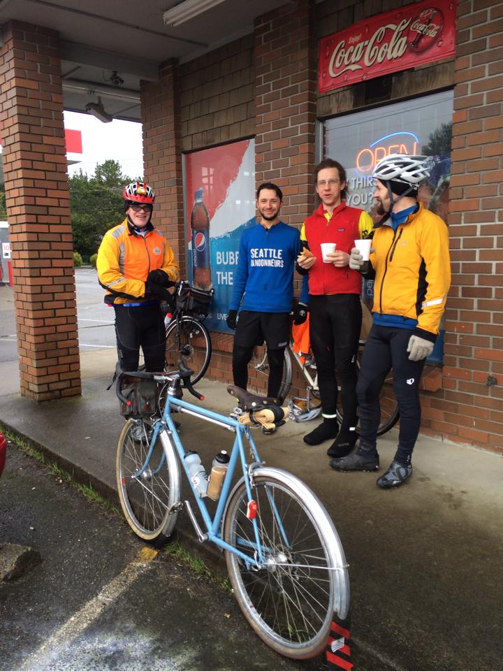 Within the first few blocks, the route kick up and climbs over Tumwater Hill. It felt good to get blood pumping in the cold rain. Our brake pads squeegeed off water from our rims on the descent as we rode through sheets of water on the road. We snaked through the westside of town, taking the back roads to stay off the freeway as long as possible. Just before the gas station at Steamboat Island, we turned onto the 101 onramp and headed north to Shelton. This is the busiest section of the route but the shoulder is wide enough to ride two abreast. Be cautious when crossing the on/off ramps. Just north of Shelton we spotted some patches of blue sky and then decided they were actually just patches of less gray sky. Before too long we were a the first control and filled up with snacks and more coffee.